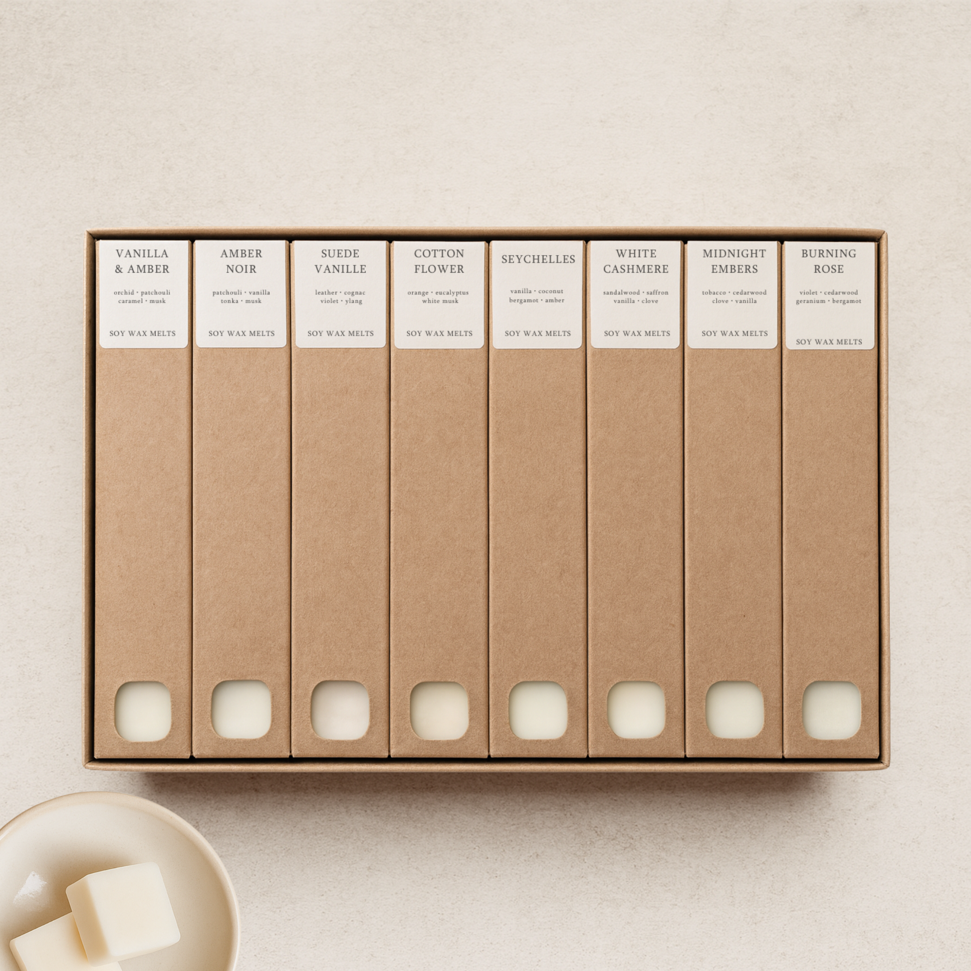 This wax melt collection contains forty-eight highly scented soy wax melts spread over eight cosy, warming scents. Beautifully presented in a kraft box ready to gift.